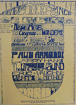 No doubt due to the combination of our madcap appearance and the exotic sounding music we made, we were often called upon to play the unusual venue. Among those, for example, we performed for attendees of the Bedrock concerts at the Carousel Ballroom. Organized and promoted by the Sexual Freedom League, one of the unique features of these gigs were the naked couples dancing at each end of the stage, their bodies painted head to toe in multi-color Day-Glo paints and bathed in ultraviolet light. For The Orkustra, playing gigs like these was all in a night’s work.