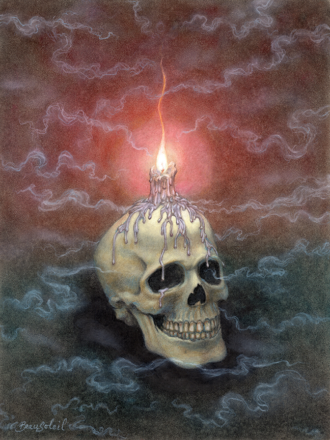 Turning up frequently in art of the imagination, at times as an incidental element, often enshrined as the object of focus, is the death’s-head. Found in graveyards and tombs and temples, on battlefields, discovered in caves and digs, and in dark places of the mind, appearing vacant and empty or leering with seemingly sinister intent, the human skull incites a primal fascination like no other object we are likely to encounter in the world.