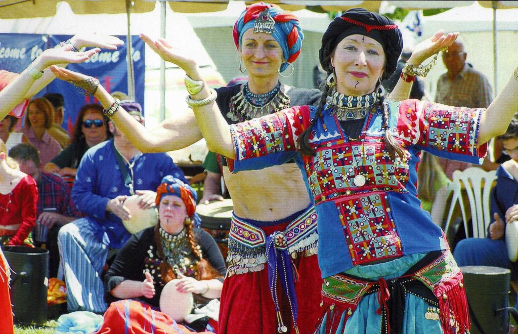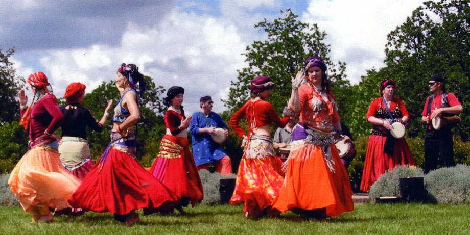 The drums begin and the dancers move out into the space provided.  We love to dance outside because there is plenty of room to move.  There are fourteen dancers in our troupe, and when we are all dancing at the same time, we take up quite a bit of space.  Zaghreets trill out and people gather around to watch.  The dancers begin to accompany the drums with their zills (finger cymbals) and the dance begins.  Sparkling bodices, twirlingskirts, flashing harem pants, the sounds of drums and zills draw the audience into the sacred space.  Spellbound, they become embraced in a Tantric ritual invoking the Goddess Shakti.