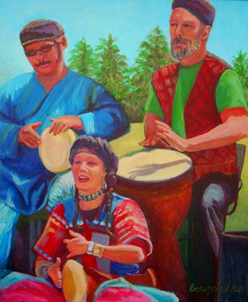 All of our drummers are married to dancers in our troupe.  As representatives of the God Shiva, they are an essential part of our ritual.  Their drums initiate the dance.  They control the rhythm and tempo.  Our drummers have a large repertoire of rhythms to draw on, from a slow, sultry chiftatelli to a rousing, heart-pounding ayoob.  Although the drummers play a supportive role in the dance, their creativity comes through in their style of playing, adding trills and slaps and pauses to the sounds of their drums, and they often develop their own rhythms and variations of traditional rhythms.  When the energy level of the drummers and dancers is high, we become Shiva and Shakti engaging in the dance of life.  The combination of music and movement blends together in a seamless creation.  All participants are transported into a trance-like state that brings us into the moment, as our sense of time dissipates.