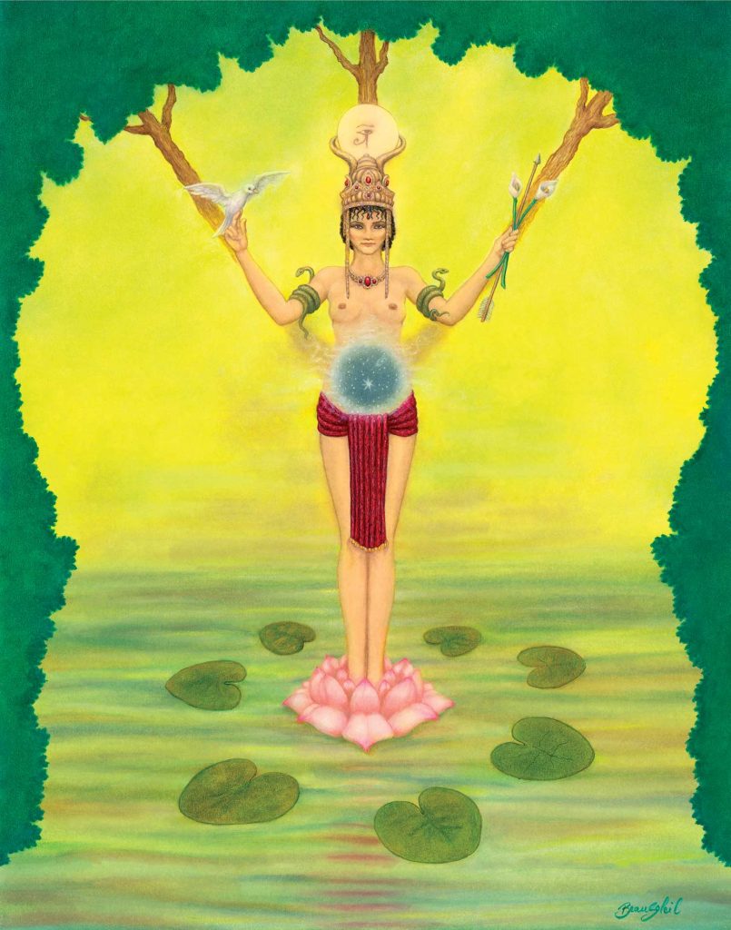 The final aim of Hindu Tantra is the realization of Cosmic Unity, which exists in the Supreme Being called Ishvara.  Ishvara is the One spoken of as an Absolute Being, without qualities; unknowable and indescribable, without beginning and without end. Tantra recognizes that we exist in a world of dulities.  Its goal is to use the power of dualities to achieve oneness.  The two main forces at work in this duality are represented by the God Shiva and his female counterpart, the God Shakti.  Tantra is the practice of uniting the male and female principles in a sacred marriage of Shakti/Shiva.  In Tantra, the human body is a microcosm of the Universe.  All that exists in the human mind and body exists in the Cosmic Mind and Body, and vice versa. During Tantric rituals, the man becomes the male deity Shiva, and the female embodies the Goddess Shakti.  An image by Paul Heusstenstamm titled, Shakti/Shiva illustrates this union beautifully.